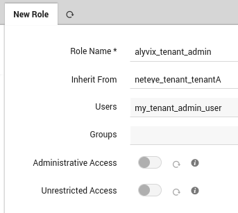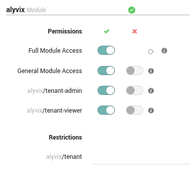 The privilege of a Tenant Admin role is granted to users with the General Module Access and alyvix/tenant-admin permissions, together with an alyvix/tenant restriction. For example, consider the case of a NetEye environment with a tenantA tenant. If you would like to grant a set of users the tenantA Tenant Admin role for Alyvix, you should enable the Alyvix module for tenant tenantA and configure a role in the Access Control as follows: